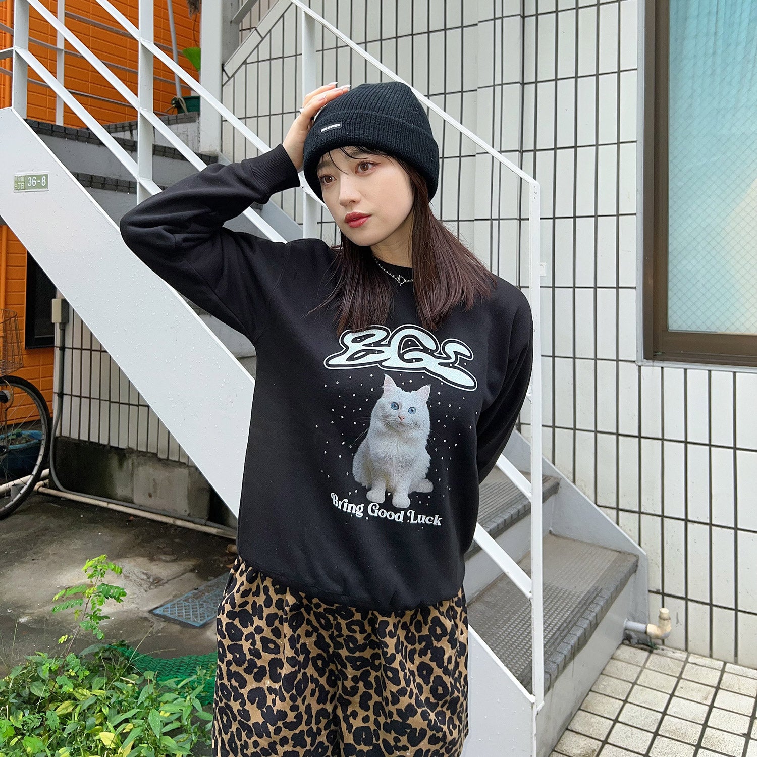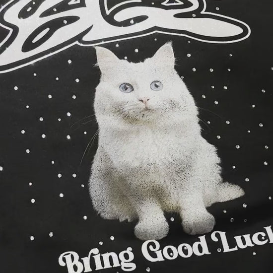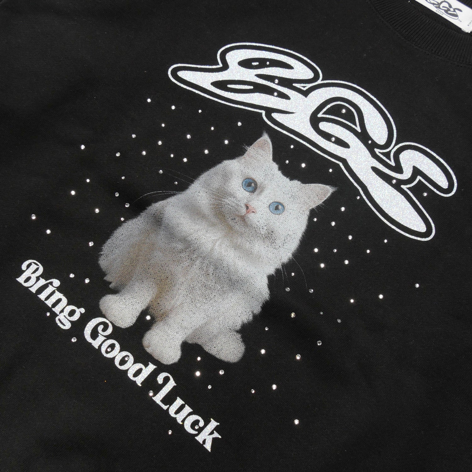 フロントにドリーミーでスピリチュアルな猫のグラフィックと、キラキラシートでブランドロゴを施し、周りにラインストーンを散りばめたクルーネックスウェット。