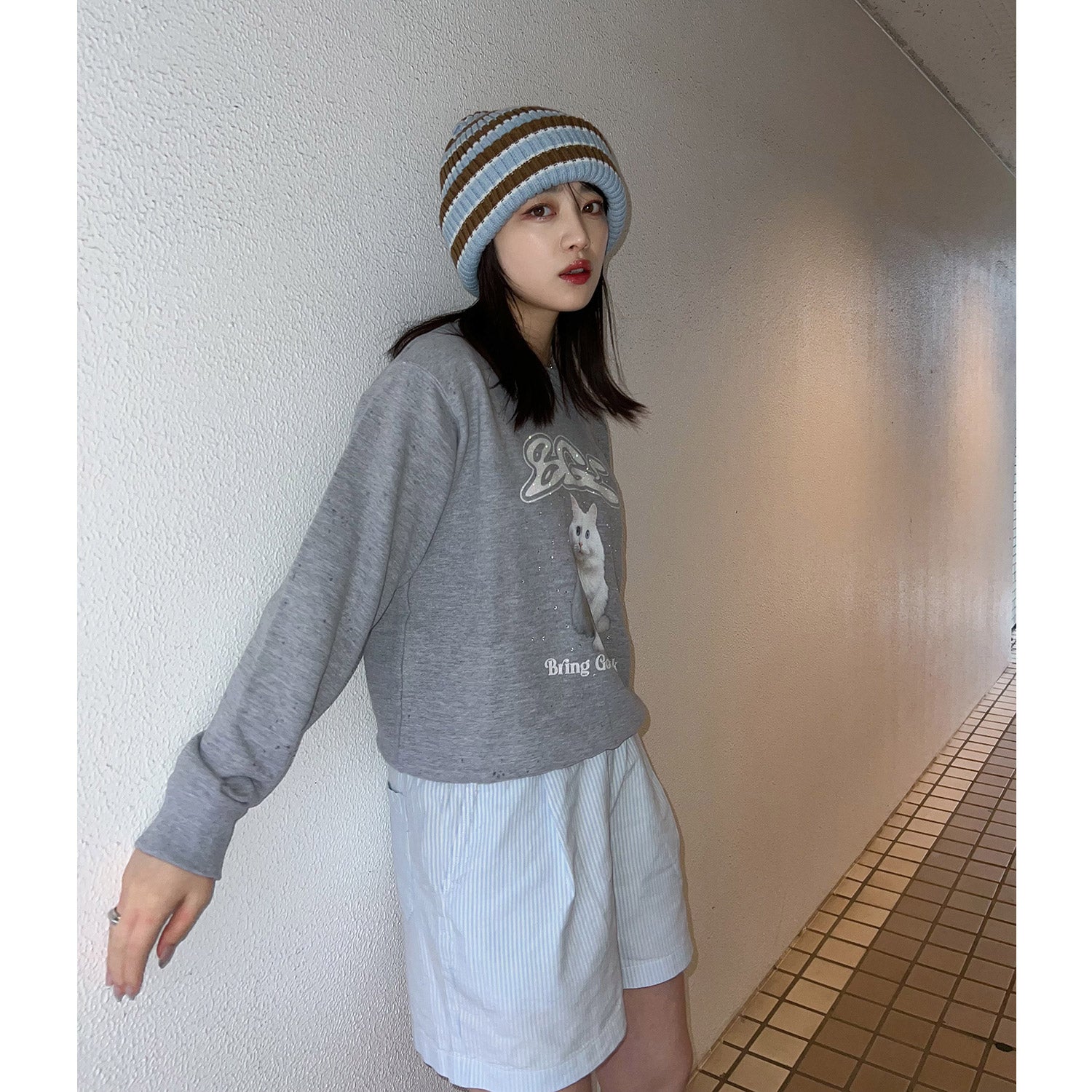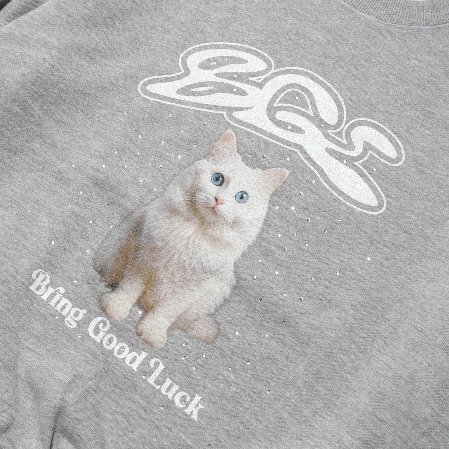 フロントにドリーミーでスピリチュアルな猫のグラフィックと、キラキラシートでブランドロゴを施し、周りにラインストーンを散りばめたクルーネックスウェット。
